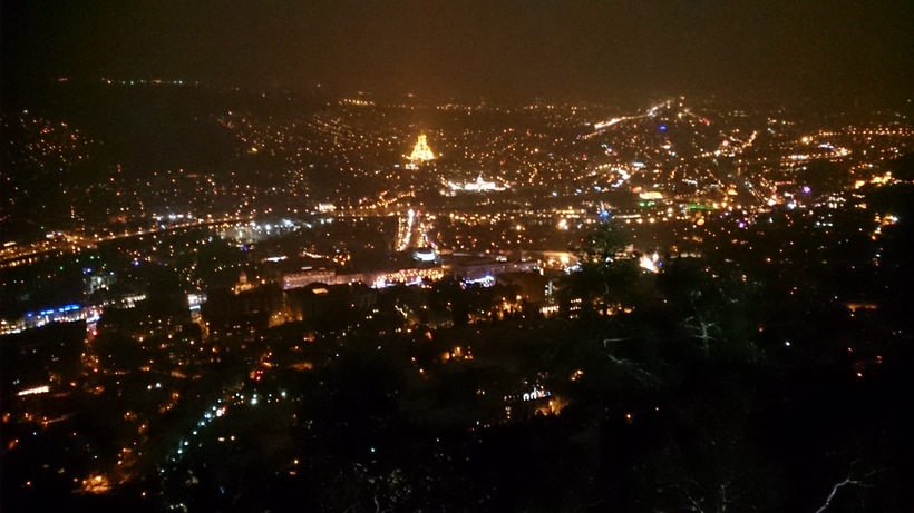 Вечерний Тбилиси также красив и переливается яркими огнями. Погода вечером может доходить до +5, так что лучше одеться потеплее для прогулки. На одной из гор, окружающей город есть парк развлечений. К нему можно добраться как на машине в объезд, так и на экзотическом транспорте - фуникулере (трамвайчик, который по рельсам и с помощью тросов поднимет на гору и спустит).