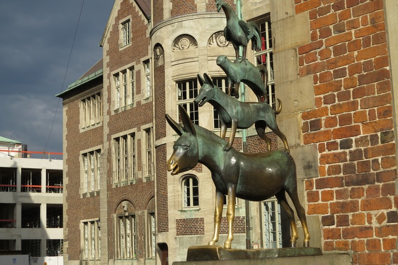 - Первый памятник был установлен в 1951 году около здания городской ратуши Бремена. Герои сказки в медном исполнении Герхарда Маркса стоят друг на друге и смотрят на культурный центр города. Скульптура является безусловным символом Бремена и красуется на каждой туристической брошюрке.
