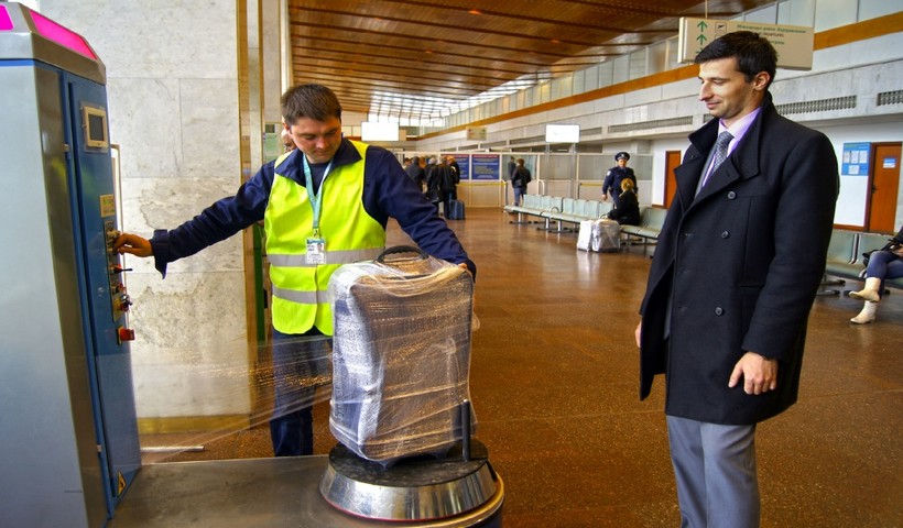 - Чтобы ваш багаж не испачкался в результате погрузки и выгрузки, рекомендую заранее обмотать сумки и чемоданы пищевой пленкой и скотчем. В аэропортах установлены автоматы для аналогичной упаковки багажа, но эта услуга уже будет платной.