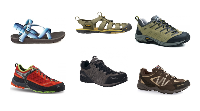 Преимущества кроссовок перед другой обувью: они очень быстро сохнут, однако не годятся для походов зимой. Нужно различать кроссовки спортивные и для хайкинга. В них отличается прежде всего материал и толщина подошвы. Туристические ботинки — это универсальная обувь для походов. Они обычно предназначены для длительной ходьбы, пошиты из плотного материала. Тяжелые ботинки созданы для бездорожья и заснеженных горных местностей. Еще есть такой тип туристической обуви как сандалии. Они предназначены для летних походов, например, к морю.