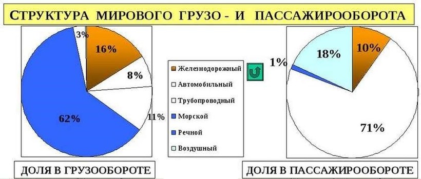 Лидером по пассажирским перевозкам в мире является автомобильный транспорт, а по грузоперевозкам — морской. Здесь все, в принципе, понятно: автотранспорт гораздо доступнее обывателю, а морской транспорт развит потому, что большую часть поверхности планеты занимает вода.
