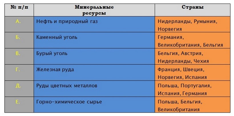 Заполните таблицу, характеризующую обеспеченность стран зарубежной Европы минеральными ресурсами, по следующей форме: