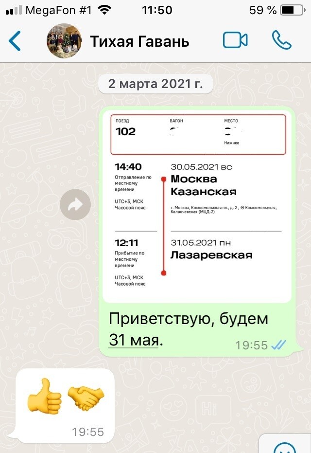 Следующей договоренностью была необходимость сообщить дату приезда и номер поезда.