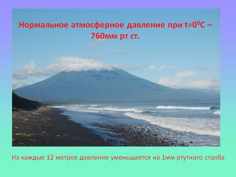Почему мы говорим о давлении на уровне моря? Да потому, что на довольно низких высотах существует закономерность - с поднятием на каждые 12 м величина давления уменьшается на 1 мм рт. ст., поэтому на разных высотах земной поверхности и давление различное.