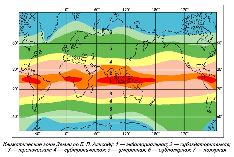 - цветовое обозначение климатических зон планеты является единым и общепринятым среди все географов;