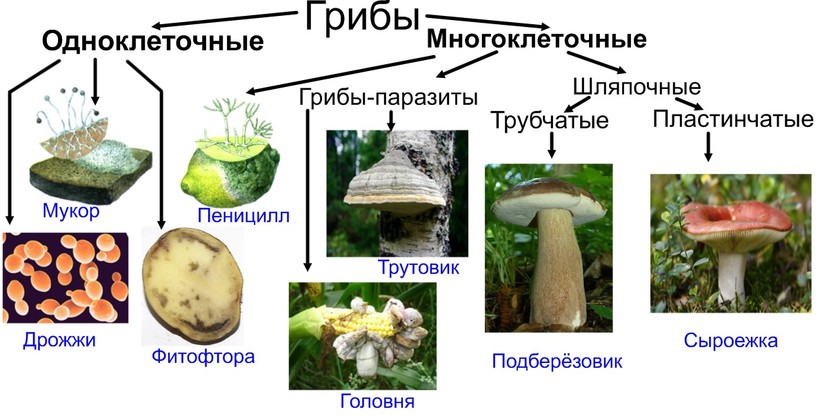 В природе существует великое разнообразие грибов , но все они делятся на одноклеточные и многоклеточные . Примерами одноклеточных грибов являются дрожжи или фитофтора . Но многоклеточные грибы в свою очередь подразделяются еще на две группы - это грибы-паразиты (внедряются в кору деревьев и поглощают от туда питательные вещества , например, гриб трутовик . И вторым подвидом многоклеточных являются шляпочные грибы. Грибы, имеющие шляпки, бывают трубчатые ,например подберезовик , или пластинчатые, например сыроежка.
