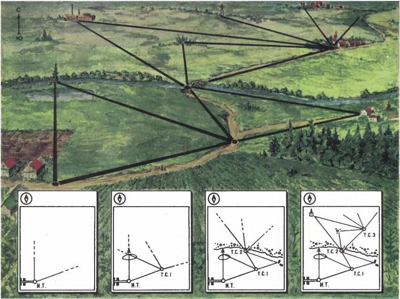 А также некоторые другие. Зарисовка проходит (как правило) с одной точки. А при необходимости выполнения работы с нескольких разных точек — всё объединяется в ходовую линию. В таком случае измеряются расстояния между шагами (или рассчитывается время движения).