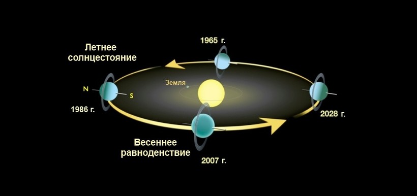 Уран же, как выяснилось, фактически лежит на боку, и через каждые 42 года на одном из полюсов наступает полярный день.