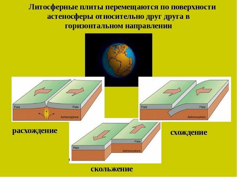 Все существующие на Земли плиты всегда находятся в движении, но скорость у них разная. Также разнятся и направления: некоторые из них сходятся, другие отталкиваются друг от друга. К примеру: Северо-Американская плита движется на встречу Тихоокеанской.