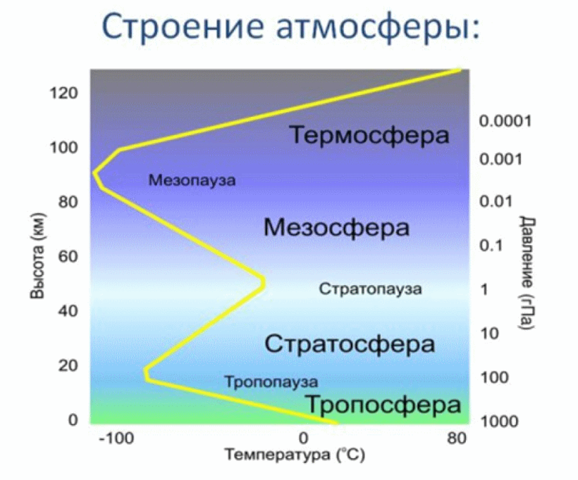 - термосфера — здесь плотность воздуха меньше в несколько сотен тысяч раз;