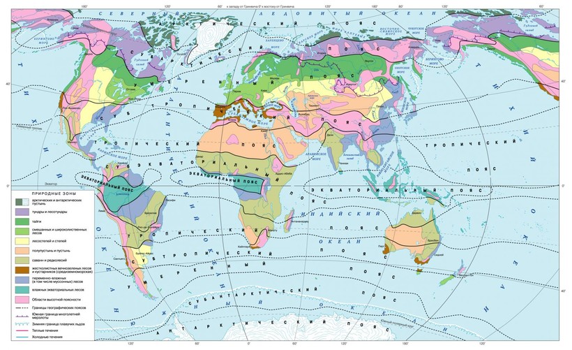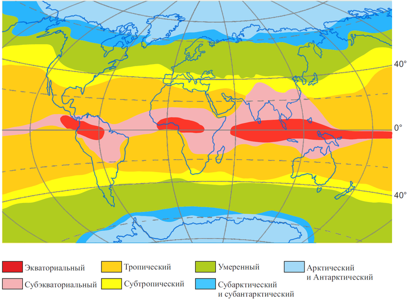 На нашей планете выделяют 5 основных поясов и 4 переходных. К основным относятся экваториальный, тропический, умеренный, арктический и антарктический. А к переходным (приставка «-суб») относятся субэкваториальный, субтропический, субарктический и субантарктический.