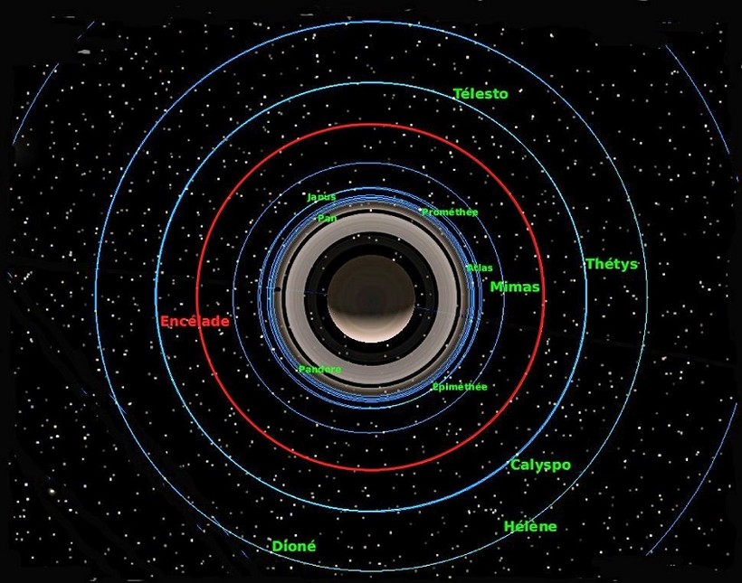 Одних только официально признанных спутников у него 62, из которых к самым крупным, имеющим сферическую форму, относятся Рея, Диона, ледяные шары Энцелад и Мимас, Тефия, состоящая из водяного льда и камня. И, конечно, гигант-Титан, второй по величине после Ганимеда. Его размер – более 5 тысяч километров, а масса настолько велика, что он способен удерживать атмосферу (причем она в полтора раза плотнее земной).
