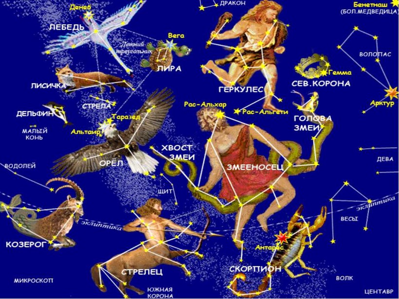 - Змееносец (считается тринадцатым созвездием зодиака, по-русски латинское название произносится почти неприлично «Офиухис»);