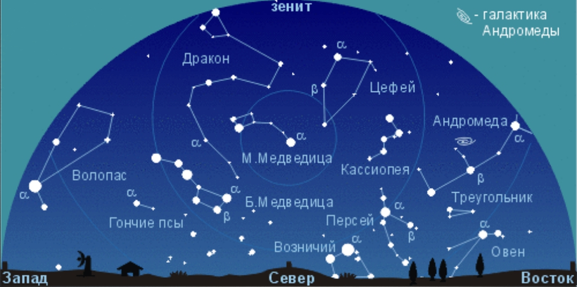- Кассиопея (похожа на перевернутую букву «М», лежит на Млечном пути, всегда хорошо видна);