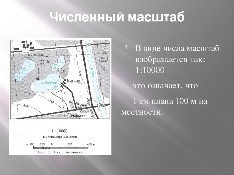 Масштаб показывает, какому расстоянию на местности соответствует 1 см на карте, глобусе или плане. Например: