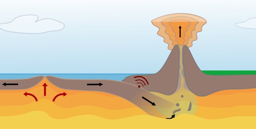 Часть плиты, которая оказалась снизу (на которую наползла другая плита), постепенно погружается в мантию и начинает плавиться. Так образуется магма — густая масса расплавленных пород с газами и парами воды. Магма легче, чем окружающие породы, поэтому она медленно поднимается к поверхности и накапливается в так называемых магматических очагах, которые располагаются чаще всего вдоль линии столкновения плит. Магма более жидкая, чем мантия, но всё же достаточно густая; в переводе с греческого «магма» означает «густая паста» или «тесто».