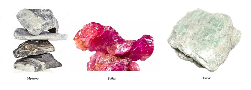 Метаморфические горные породы происходят из ископаемых магматических и осадочных пород по причине воздействия на них высоких температур и сильного давления . В качестве примера можно выделить мрамор, рубин и тальк.