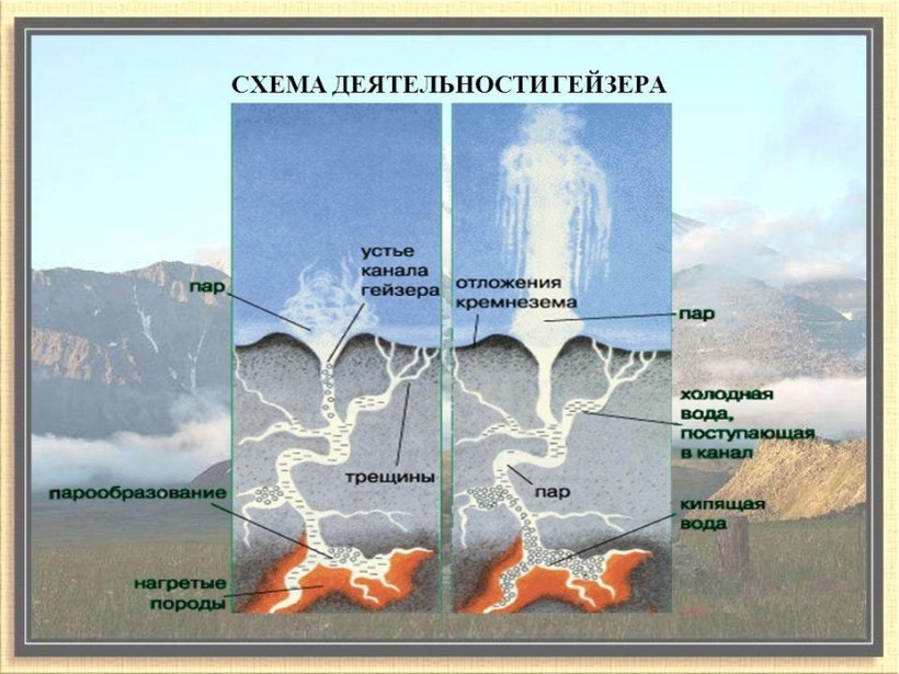 По сути, это все, что осталось от былой вулканической активности на нашей планете. Гейзеры представляют собой достаточно величественное явление: кипящая вода с грохотом вырывается на поверхность в виде столба, который нередко достигает 50 метров. Это продолжается всего несколько мгновений, а затем напор постепенно убывает, пар рассеивается, и наступает тишина. Но бывают и такие источники, что напоминают лужи горячей воды, покрытые пузырьками. Как правило, место вокруг представляет собой нечто вроде бассейна или кратера небольшой глубины. В радиусе нескольких метров поверхность покрыта мощными слоями отложений кремнезема — гейзеритом. В некоторых местах вырастают огромные конусы, порой до нескольких метров в высоту. Для образования таких фонтанов необходимы: