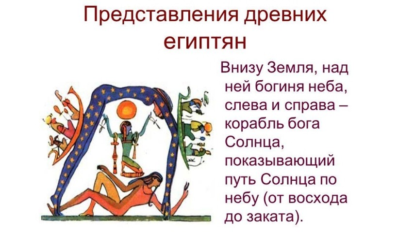 Первые полагали, что в центре мира возвышается гора, на склоне которой и расположена их родная Вавилония. Гора плавает по морю, и, как ни странно, никто не задумывался, что море тоже должно на чем-то находится. На небе, как они считали, все так же, как на суше: реки, леса и воздух. Что касается египтян, то поскольку они были достаточно умелыми мореходами, мир, как им казалось, был разделен на 3 части: сушу, небо и корабль, на котором бог Солнца каждый день проходит по морю.