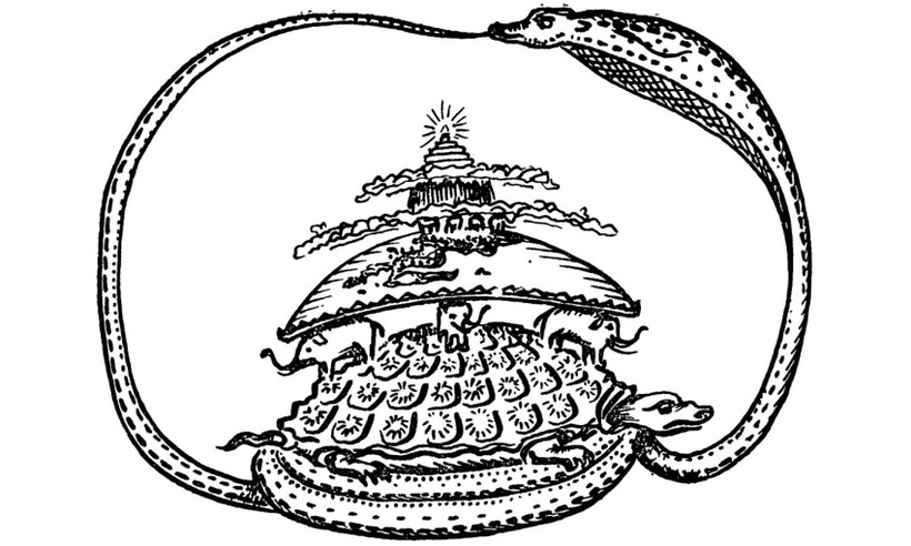 В период 3000 лет до нашей эры в древней Индии люди представляли Землю в виде полусферы, которая держалась на четырех слонах. Слоны, в свою очередь, стояли на черепахе. А черепаха стояла на змее. Змея была свернута в своего рода кольцо, которое огибало всё пространство. Именно эта модель строения Вселенной была одной из наиболее популярных в то время. И даже сейчас изображение такой Земли можно найти в Интернете.