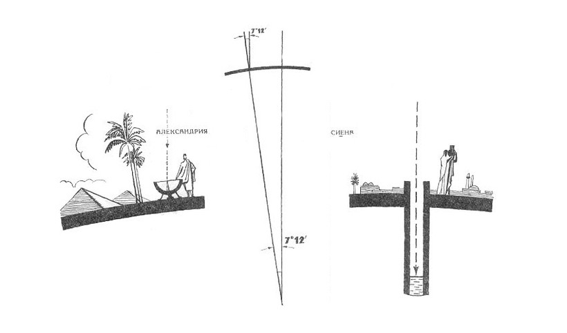 Сегодня с этим справится, пожалуй, любой школьник, но тогда, более 2000 лет назад, это было сделать практически невозможно. Более того, в те времена большинство полагало, что мир представляет собой плоский диск, с края которого можно свалиться в бездну. Однако ученый, живший в Александрии, навсегда вошел в историю как первый, кому удалось вычислить размеры нашей планеты. Но как он это сделал, ведь в его арсенале не было практически никаких специальных приборов? Он использовал те данные, которыми располагали египтяне, а именно - тот факт, что в день летнего солнцестояния лучи светила достигают дна самых глубоких колодцев города Сиена. При этом, в Александрии такое явление не наблюдается. Итак, в 240 году до н.э., ученый использовал обычную чашу с иголкой, чтобы понять, каков угол светила в небе. Далее были произведены следующие расчеты:
