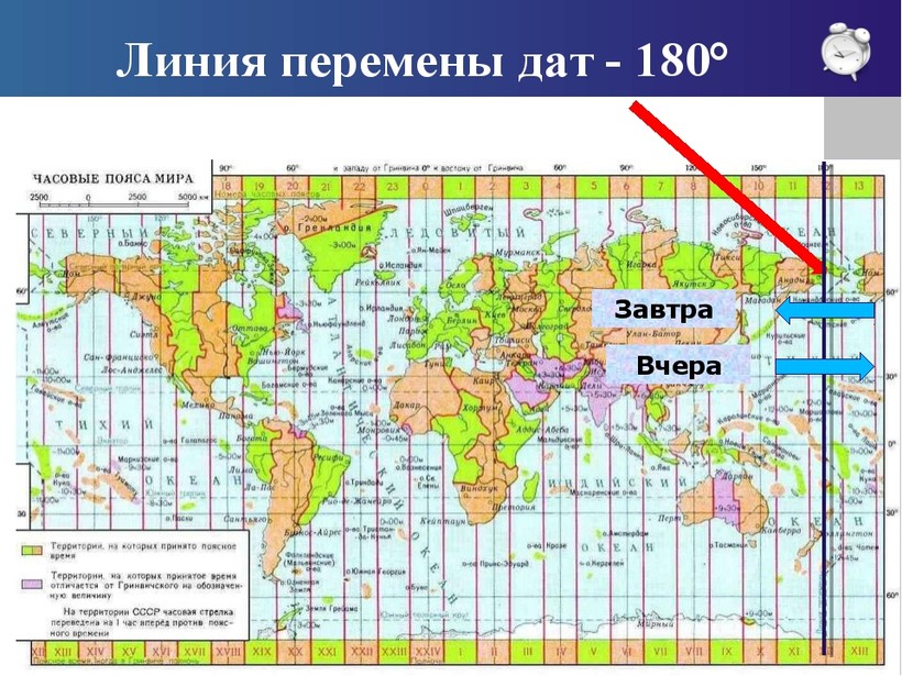 Когда настает новый день в системе официального времени? Дело в том, что через середину 12-часового пояса, приблизительно по меридиану 180°, создана линия перемены дат. Она представляет из себя условную линию, по обеим сторонам который часы и минуты одинаковы, но даты разные. При её пересечении с востока на запад нужно прибавить один день, а с запада на восток - вычесть. Это можно наблюдать при путешествии самолетом.