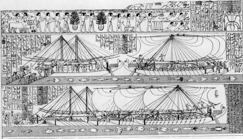 Среди множества уникальных экспонатов Эрмитажа хранится свиток, который повествует о путешествии египетского моряка. Свиток датируется 2000 годом до нашей эры и в мельчайших подробностях описывает ход плавания. Надо сказать, что папирус содержит массу любопытных данных, которые свидетельствуют о том, что в те далекие времена египтяне совершали дальние морские экспедиции. Вообще, египетские письмена часто упоминают некую страну Пунт, которая славилась своим богатством и манила фараонов. По имеющимся данным, чуть ли не каждый царь Египта отправлял туда суда за экзотическими товарами. Например, во времена Пиоти II (2249-2161 гг. до н.э) известно о 12 экспедициях. Но что это за таинственная страна? Историки полагают, что это было побережье Индии, а свидетельство тому — сандаловое дерево, обнаруженное в нескольких гробницах. Однако и это не было пределом для мореходов Египта.