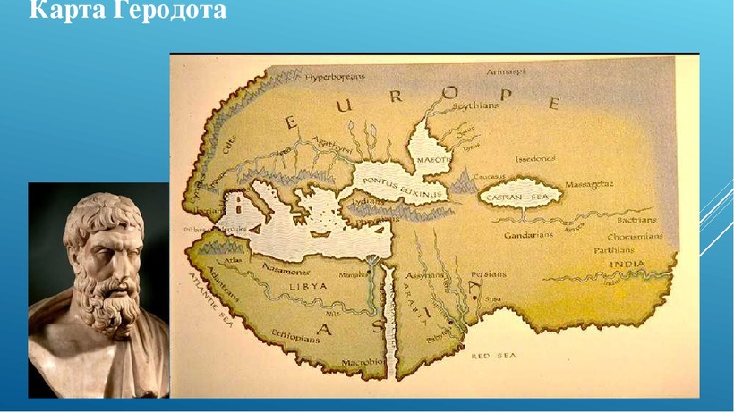 Геродот историк из Древней Греции, которого называют "отцом истории". Но кроме вклада в развитие такой науки как история, он сделал очень много для географии. Он был первым, кто в своем труде по истории не просто пересказывал воспоминания путешественников, а писал о своих путешествиях. В своем труде он излагает много географических фактов, прилагая к нему карту мира (такого каким его тогда представляли).