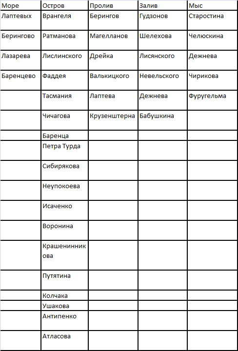 Выпишите объекты, названные в честь русских первопроходцев на побережье и в пределах Северного Ледовитого и Тихого океанов. Результаты работы оформите в виде таблицы.