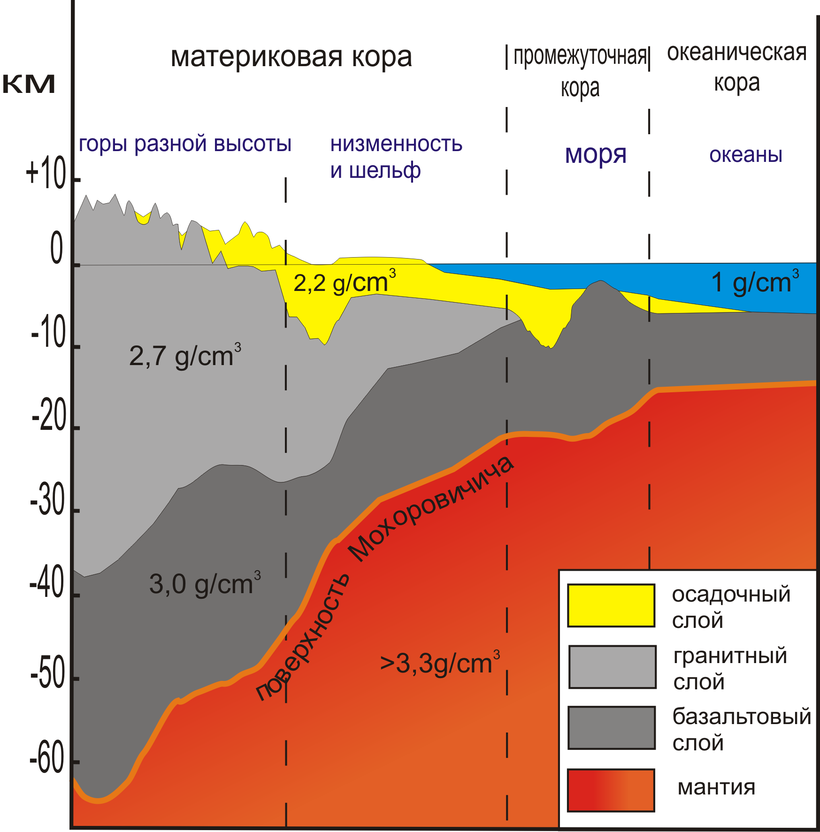 земная кора под ним континентальная (в ее строении есть гранитные слои, а в океанической их нет и никогда не было);
