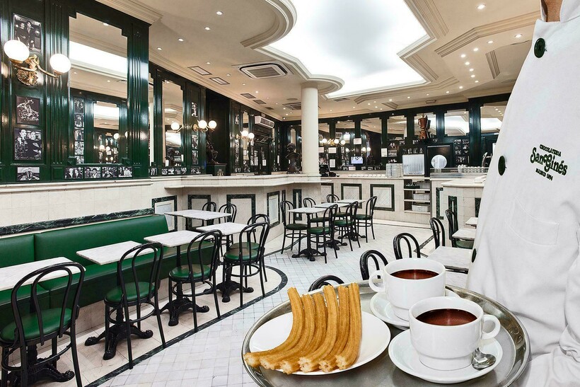 Внешне здание бара похоже на кофейни конца XIX века. Здесь белые мраморные столешницы, плитка на полу, деревянные стулья с изогнутыми спинками. В этом месте можно попробовать испанский горячий шоколад и чуррос — обжаренные пирожные из заварного теста.