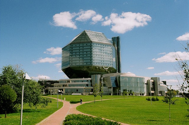 Национальная библиотека Белоруссии - это уникальное и современное здание, построенное в 2006 году, хотя в Белоруссии уже существовала Национальная библиотека с 1922 года. Недавно построенное здание на улице Независимости в Минске является прекрасным образцом современной архитектуры, которая привлекает практичностью и внешним видом. Вместе с главной частью библиотеки в форме полуправильного многоугольника, библиотека вмещает 2000 читателей, а также предоставляет конференц - зал на 500 человек. Дизайн библиотеки был разработан архитекторами Михаилом Виноградовым и Виктором Крамеренко. Библиотека содержит крупнейшую коллекцию белорусского печатного материала, а также 3-ю по величине коллекцию русского печатного материала.