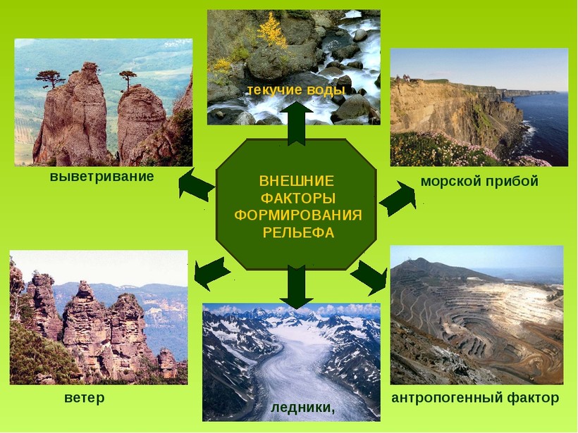 Все существующие формы рельефа возникли путем воздействия на земную поверхность тех или иных природных факторов. К ним относятся: ветер, дождь, лед, химические процессы. Такие явления, как землетрясения и извержения вулканов, которые мы привыкли считать стихийными бедствиями, также принимали участие в формировании рельефа на различных участках нашей планеты. Например, разрушения, которые приносит ветер и вода, образуют долины и каньоны. В некоторых случаях, чтобы произошли какие-то изменения, могут потребоваться миллионы лет.