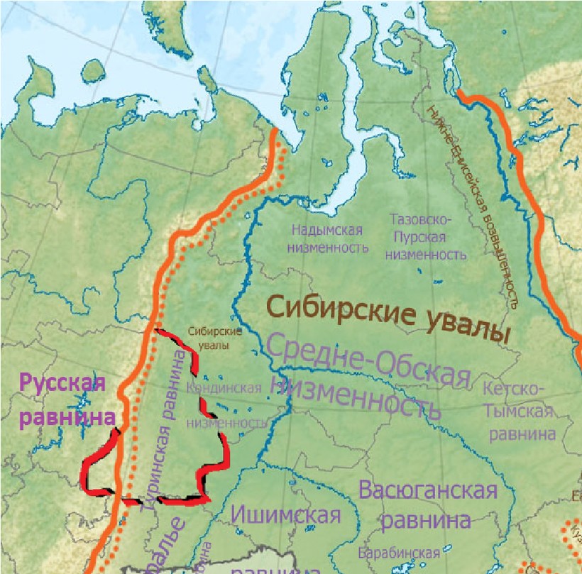 - Северно-Сосьвинская возвышенность (на северном участке Западно-Сибирской равнины);