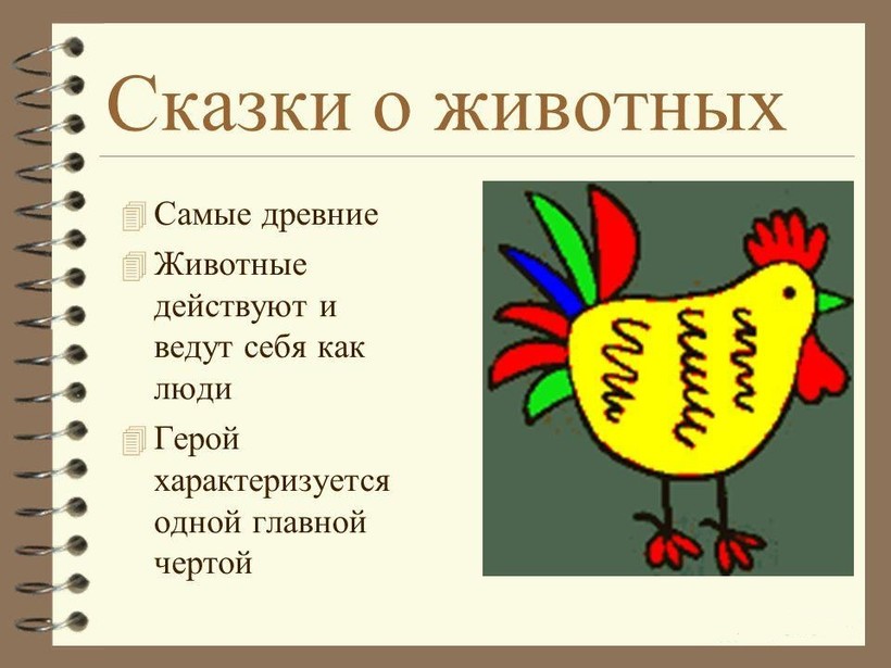 «Лисичка сестричка и серый волк», «Бобовое зёрнышко», «Курочка Ряба» - сказки о животных. Пословицы: «Для медведя зима – одна ночь», «Седина бобра не портит».