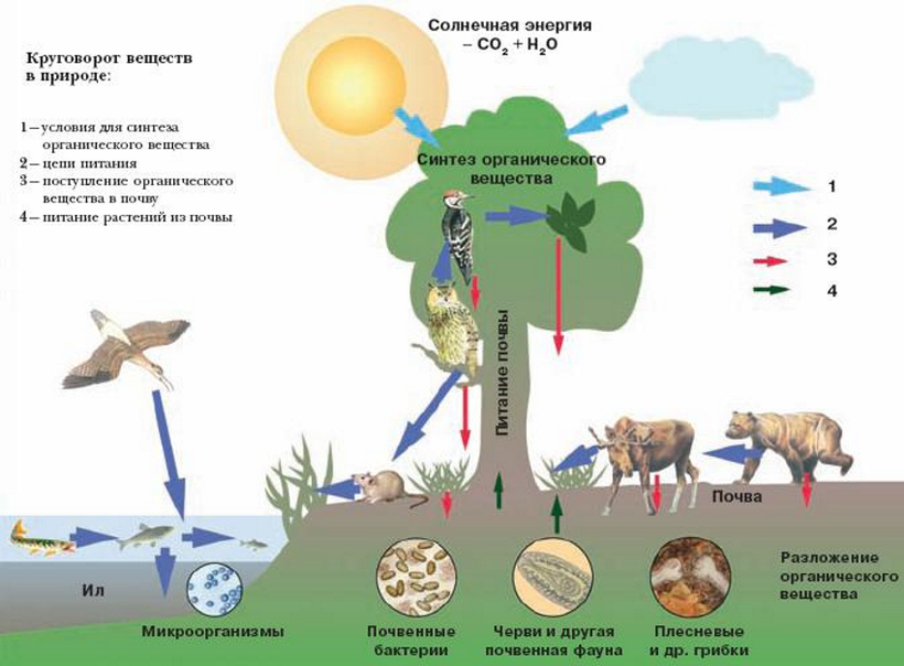 - благодаря редуцентам (грибам, бактериям и так далее) означенные вещества возвращаются в атмосферу или почву;