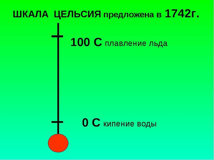 В конце концов, шкала приобрела современный вид только в 1742 году. Шведский физик А. Цельсий решил разделить шкалу на 100 равных между собой интервалов. Нижний интервал он принял за 0 градусов, а верхний — за 100 градусов.