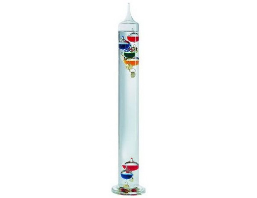 Но он имеет к нему лишь косвенное отношение. Заслуга Галлилея в том, что он первым установил, что при изменении температуры плотность воды меняется. Это открытие и легло в основу работы самого первого термометра, который был создан 1641 году герцогом Фердинандом Вторым. Прибор представляет из себя герметичный сосуд с жидкостью, внутри которого плавают стеклянные шарики. Шарики так наполнены жидкостью, что имеют разную плотность. Самая высокая – у нижнего шара, а самая низкая плотность – у верхнего. К каждому из шариков снизу прикреплена бирка, с указанной температурой. Когда температура воздуха в помещении понижается, вода в колбе остывает и её плотность увеличивается. Шарики поднимаются вверх. А когда температура воздуха растёт, вода в колбе нагревается и плотность её падает – шарики опускаются на дно. Термометром Галилея можно измерить температуру в диапазоне от 14 до 30 градусов Цельсия.