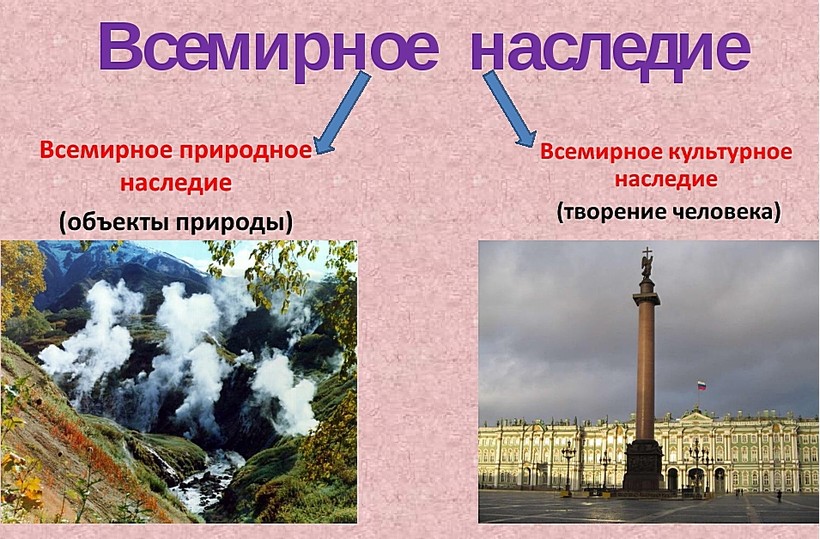 Всемирное наследие ЮНЕСКО - это созданные людьми или природные постройки и объекты, имеющие важное социальное, историческое или экологическое значение. Задача населения Земли - беречь эти объекты, хранить их от негативного воздействия, а также популяризация этих объектов, то есть распространение информации о них. Эти объекты расположены по всему миру, всего их 962. В нашей стране таких объектов 26. К Всемирному наследию относятся: природные (Всемирное природное наследие) и культурные объекты (Всемирное культурное наследие).