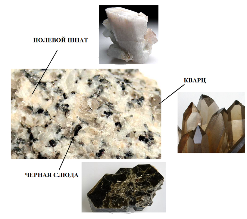 Главная особенность — они занимают большие площади. Горные породы нельзя описать формулой, потому что они являются «смесью» минералов разного химического состава. В граните, например, три главных минерала: серенький, похожий на стекло кварц, черная или белая чешуйчатая слюда, а также белый, желтоватый, розоватый полевой шпат (он непрозрачный). Все зернышки приблизительно одного размера, некрупные и перемешаны хаотично.