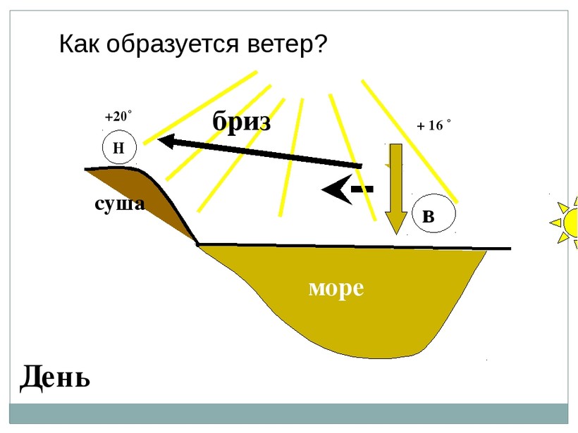 Днем Земля прогревается на Солнце, при чем, происходит это неравномерно, у предметов температура выше, нежели у воды. Теплый воздух с суши поднимается вверх, его место занимают потоки прохладного воздуха с моря. Ночью происходит обратный процесс.
