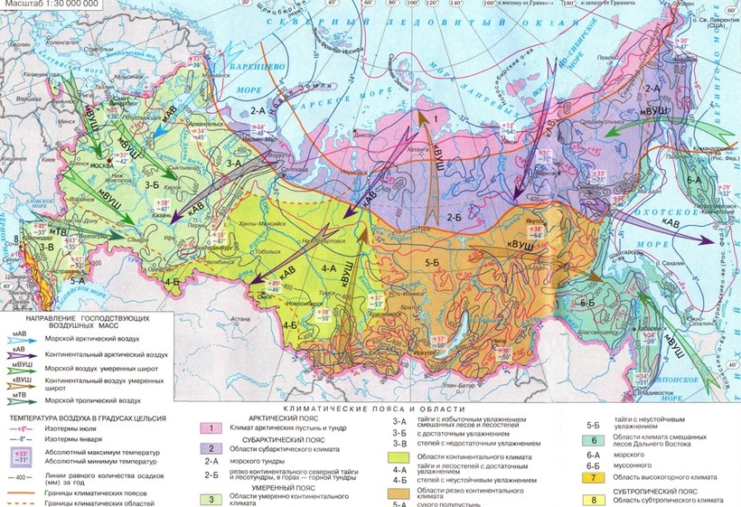 На территории России формируются четыре климатических пояса: арктический, субарктический, умеренный и субтропический. Внутри каждого пояса выделяются климатические области.