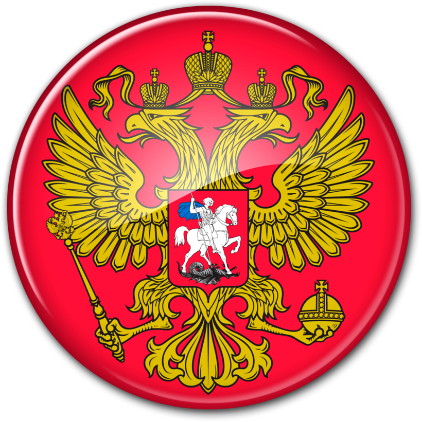 2. Российский государственный герб. Четырёхугольный (нижние края герба закруглены). Изображен двуглавый орёл на красном фоне, держащий скипетр(в правой лапе) и державу (в левой). Герб ведет историю с 1497 года.
