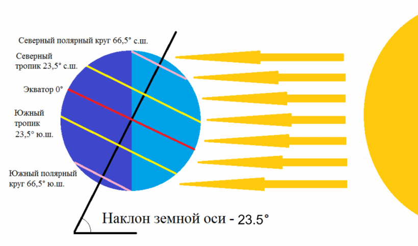 Наша планета, как известно, крутится вокруг своей оси. Эта ось идет не прямо, а с небольшим наклоном вбок, примерно на 23-24 градуса.