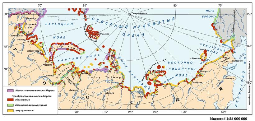 На территории Арктики выделяется зона шельфа с островами, материковая окраина Евразии, Северной Америки и Арктический бассейн. Характерной особенностью данной территории является то, что Арктика имеет большую шельфовую зону, которую омываю окраинные моря: