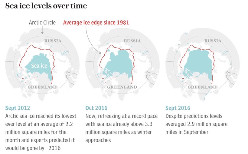 - арктические льды уберегают Землю от перегрева, отражая солнечные лучи. В последние десятилетия запустился процесс таяния льда (его уровень упал на 70% за последние 35 лет!), что, в свою очередь, влияет на повышение температуры по всей планете.