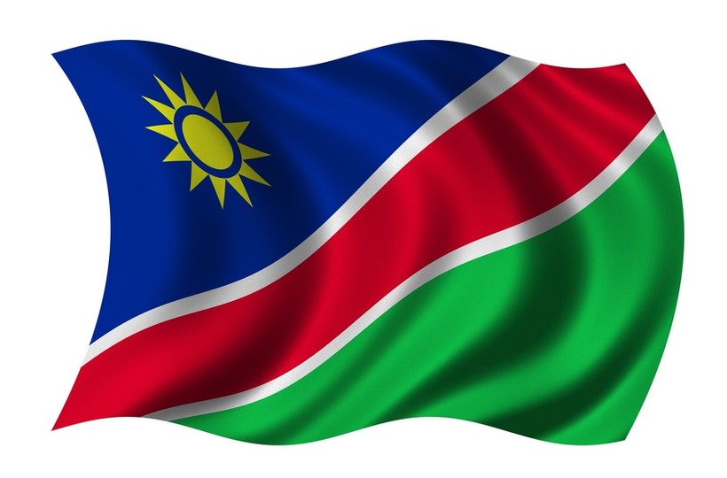 Флаг Намибии состоит из трех диагональных полос - верхняя полоса голубого цвета, средняя красного цвета, а нижняя полоса зеленого цвета. Голубая и зеленая полосы имеют одинаковый размер. Красная полоса в середине подчеркнута сверху и снизу тонкими белыми полосками. На верхней голубой полосе изображено солнце с 12 прямыми лучами.