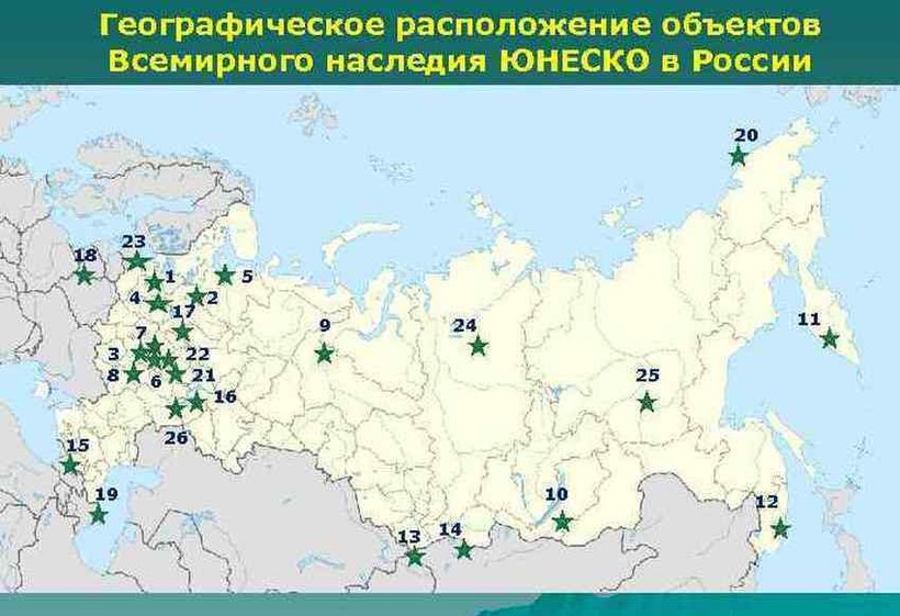Всего на территории РФ находится 25 таких объектов, из которых 2/3 — это объекты культурного наследия, а 1/3 — природные. Расположены они неравномерно по территории: большинство находится в западной части страны. Справедливо будет заметить, что много природных объектов не являются легкодоступными. К таким бы я отнес: