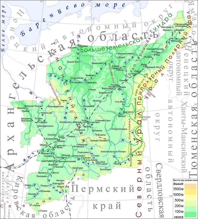 Оставшиеся 3% простор занимают горы. В пределах региона расположились три района западных склонов Уральских гор: Приполярный, Северный и Полярный. Могу с гордостью сказать, что именно в Коми находится наивысшая точка Уральских гор — г. Народная с высотой, равной 1895 м. В целом, Приполярному Уралу присущи высокие вершины и ледники, а также сильная расчленённость.