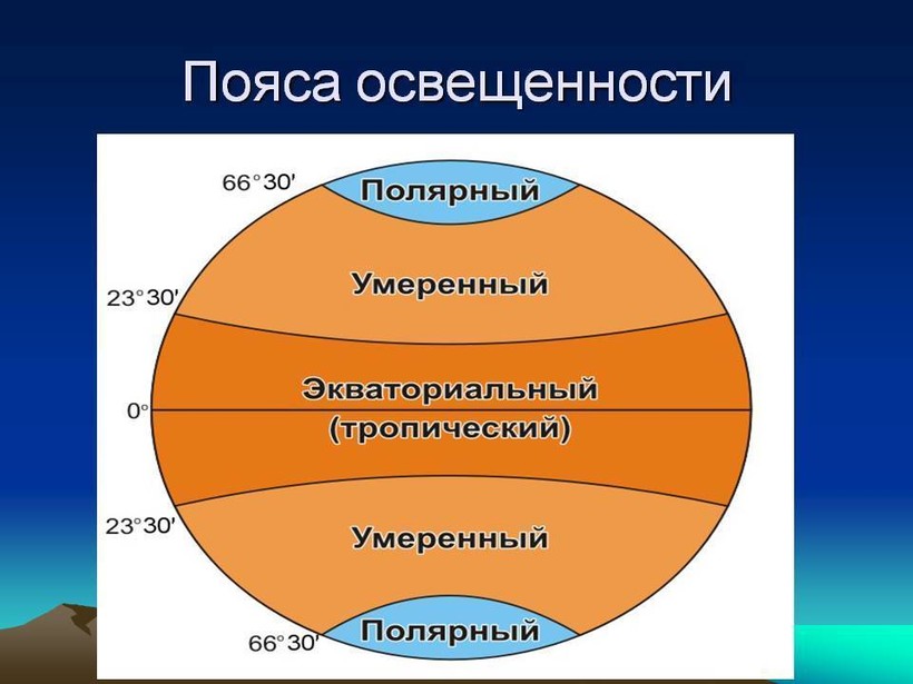 - В умеренных поясах освещенности в течение суток всегда присутствует смена дня и ночи. Именно умеренные пояса могут похвастаться наличием четырех времен года.